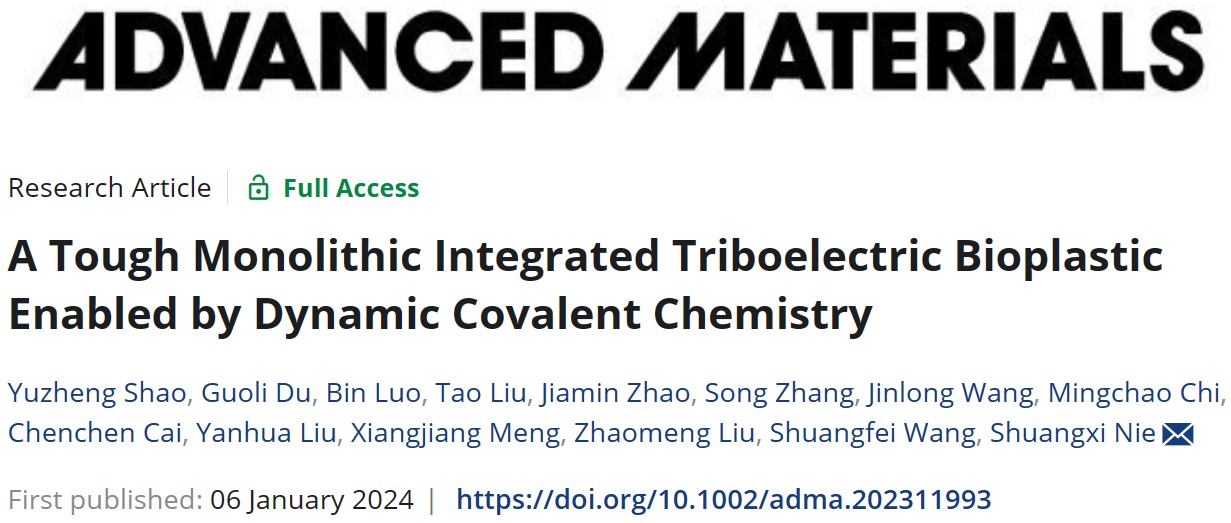 公司王双飞院士团队在材料领域国际顶刊《Advanced Materials》发表纤维素摩擦电材料重要研究成果