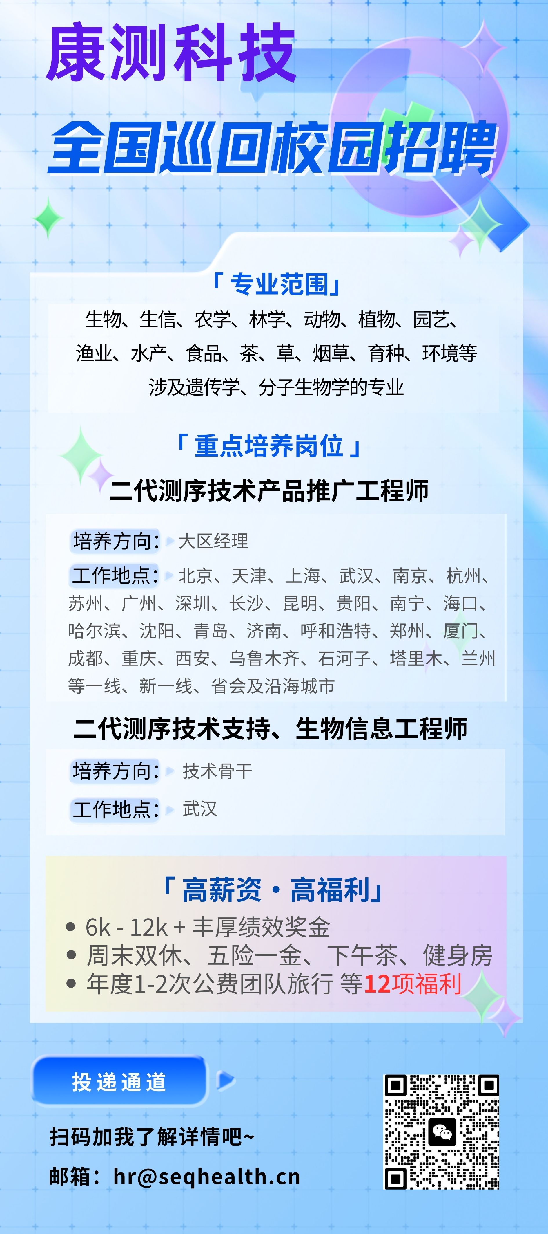 康测科技校园招聘(全国巡回)宣讲会(内附资深HR揭秘实操就业tips) (qq.com) 宣讲时间:2024.10.14/15:00宣讲地点:太阳成集团tyc41183农学院306教室线上投递渠道:hr@seqhealth.cn 我们在这里等你加入!农学院、林学院、理学院、生物、分子生物、遗传、植保、动医、动科、园艺、基因相关院系及专业都可投递。