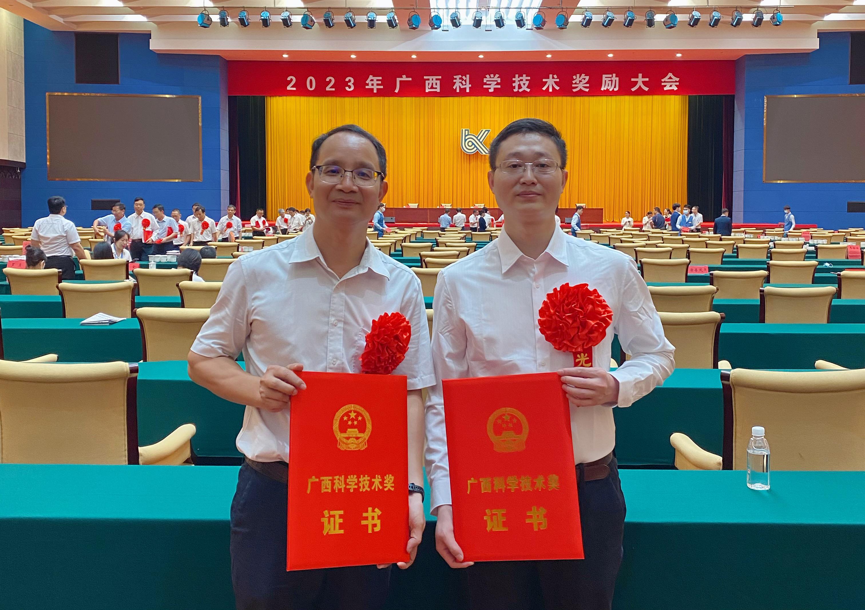 2023年5月30日,广西科学技术奖励大会在南宁召开,自治区党委书记、自治区人大常委会主任刘宁出席大会,为获奖代表颁奖。太阳成集团tyc41183聂双喜教授荣获“青年科技杰出贡献奖”(奖励等级和荣誉效力等同于广西自然科学一等奖),李凯教授主持完成的“糖厂三废减量化及治理关键技术研发与应用”荣获“科学技术进步二等奖”。