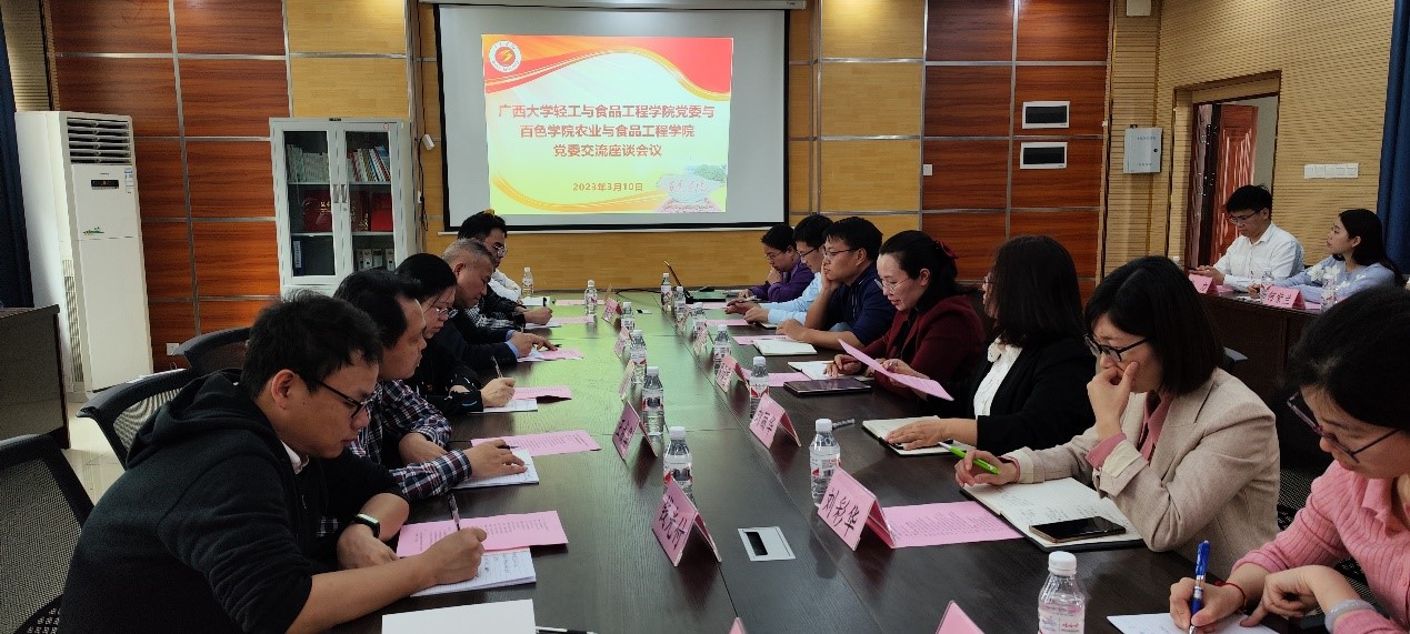 第三站,赴百色学院农业与食品工程学院座谈交流。首先,百色学院农业与食品工程公司党委书记刘丽华对公司党建工作做了简要介绍,她指出,一直以来,学院扎根红色土地,有针对性地开展党建品牌建设,取得了一系列标志性成果。随后,公司党委书记许树沛介绍了学院发展沿革、团队力量、教学科研、员工培养等基本情况。最后,公司制糖工程系教工党支部书记陆登俊对五星级党支部做了经验分享,重点介绍了党支部强基固本建设以及支部工作创新发展模式。自由交流阶段,双方就党建工作重点难点、党建引领团队建设、“党建+”等方面展开讨论。