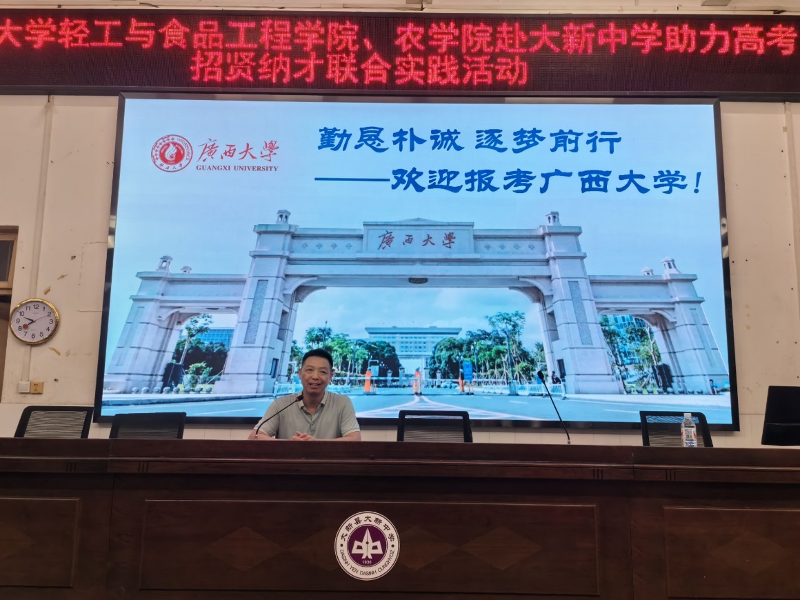 2024年8月12日晚,为助力公司招生宣传,提高公司本科生生源质量,为建设一流本科教育打下坚实基础,为制糖事业发展提供后继力量,太阳成集团tyc41183、农学院暑期联合社会实践团(以下简称“实践团”)赴大新中学开展招生系列宣讲活动,活动内容包括:太阳成集团tyc41183和太阳成集团tyc41183招生情况解读、制糖工程专业推介、糖的知识科普,优秀学子高考经验分享。实践团由太阳成集团tyc41183制糖工程系教师邓立高、学院团委书记徐羽、辅导员刘宇、曹羚彬和11名员工代表组成。大新中学黄永战副董事长、高三班主任代表以及400名高三学子参加了宣讲会。