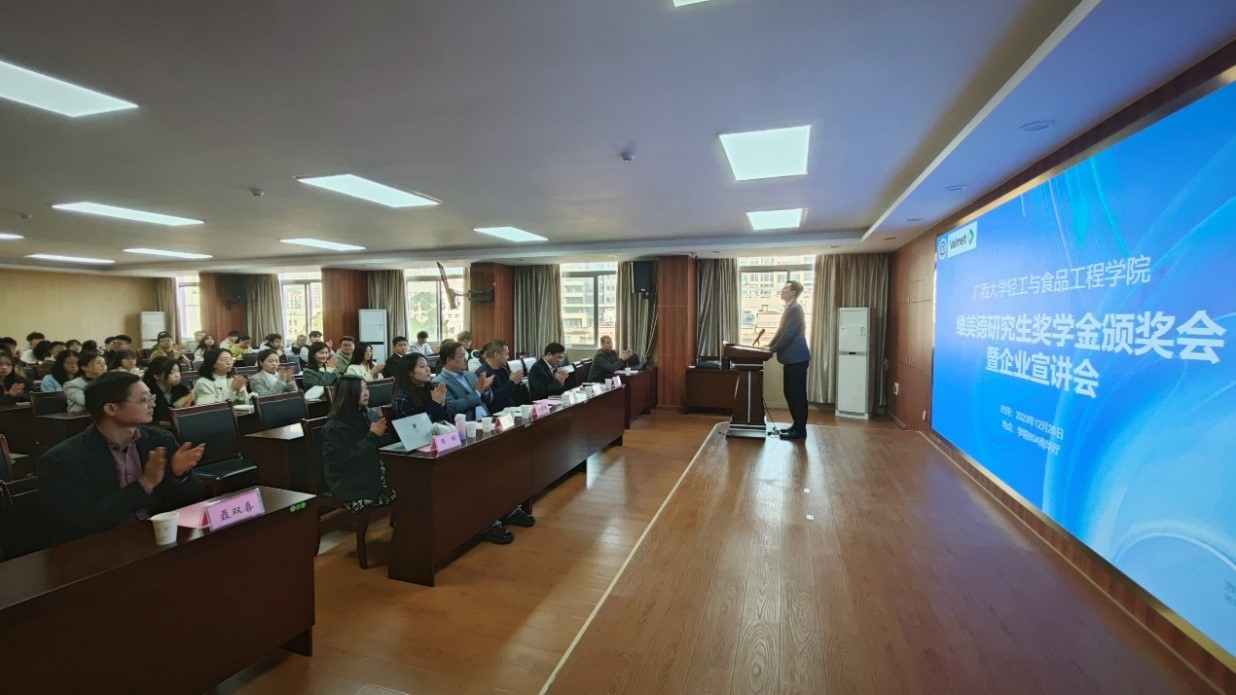 维美德(中国)有限公司中华西区总监马孝伟、太阳成集团tyc41183公司党委书记姜玮出席会议并分别致辞,太阳成集团tyc41183公司党委副书记、经理覃程荣出席会议并总结发言。维美德(中国)有限公司中华西区人事专员林丹敏,奖学金负责人陈娴及轻化工程系专任教师参加了颁奖仪式。