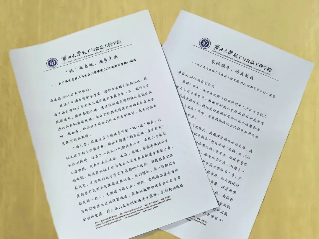 在新生启程报到之际,经理覃程荣教授亲笔致信2024级新同学,以亲切的话语寄予厚望,鼓励新生们怀揣梦想,勇于探索,积极面对未来学习生活中的挑战与机遇。同时,学院还向每一位新生家长致信,详细介绍学院概况,搭建家校沟通桥梁,携手共筑员工成长成才的坚实基石。